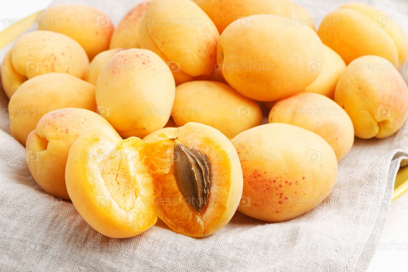 Крупным планом изображение спелых плодов абрикоса на тканевой салфетке. Мелкий фокус