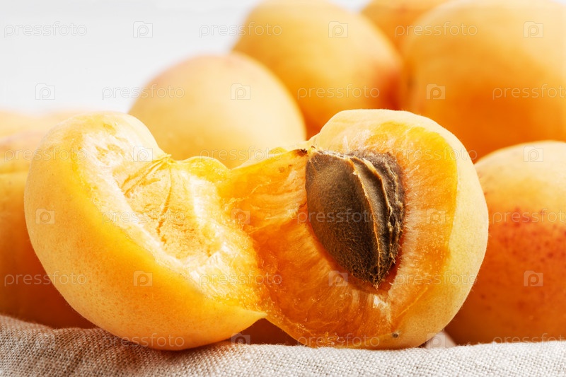 Крупный план половинчатых и цельных спелых плодов абрикоса на тканевой салфетке. Мелкий фокус