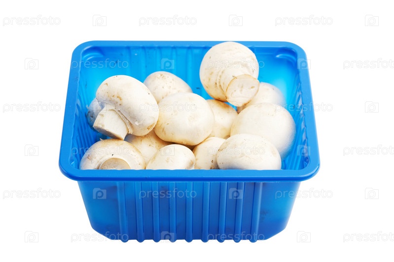 Шампиньоны крупным планом в синей пластиковой упаковке