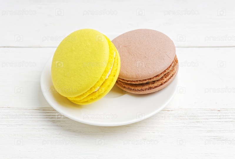 Крупным планом два миндального печенья лимон и шоколад на белой тарелке на белом деревянном столе