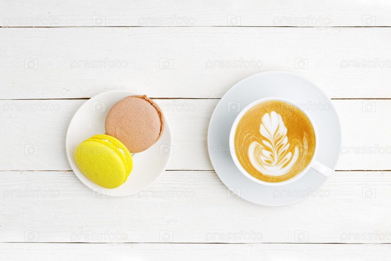 Чашка кофе капучино и два лимона миндального печенья и шоколад на белом деревянном столе. Вид сверху