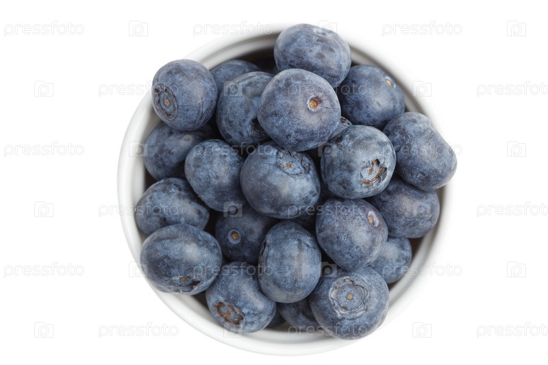 Черника в белой керамической миске, изолированная на белом. Вид сверху