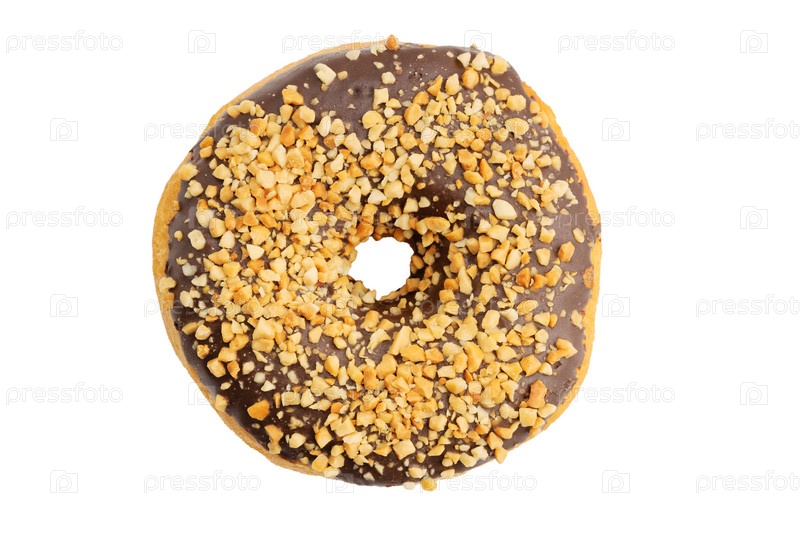 Пончик крупным планом, покрытый шоколадом и посыпанный тертыми орехами, изолированными на белом. Вид сверху