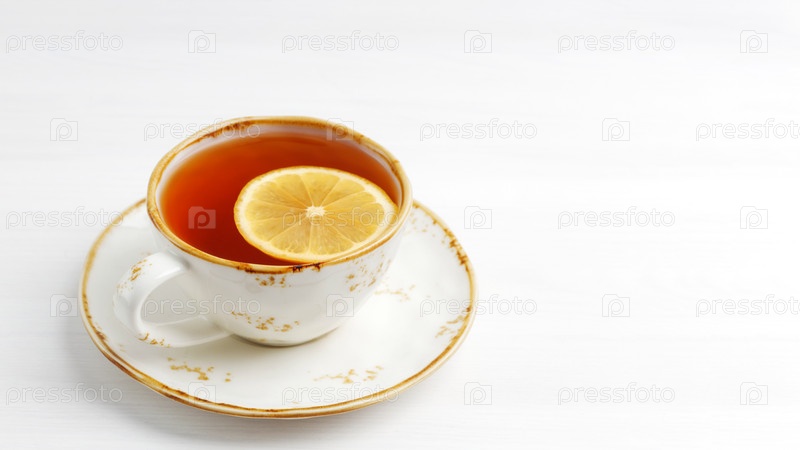 Чашка чая с ломтиком лимона на белом деревянном столе. Копипространство
