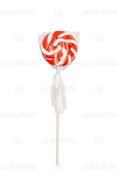 Красно-белый карамельный леденец, скрученный в спираль, завернутый в прозрачную целлофановую пленку. Изолированные на белом фоне