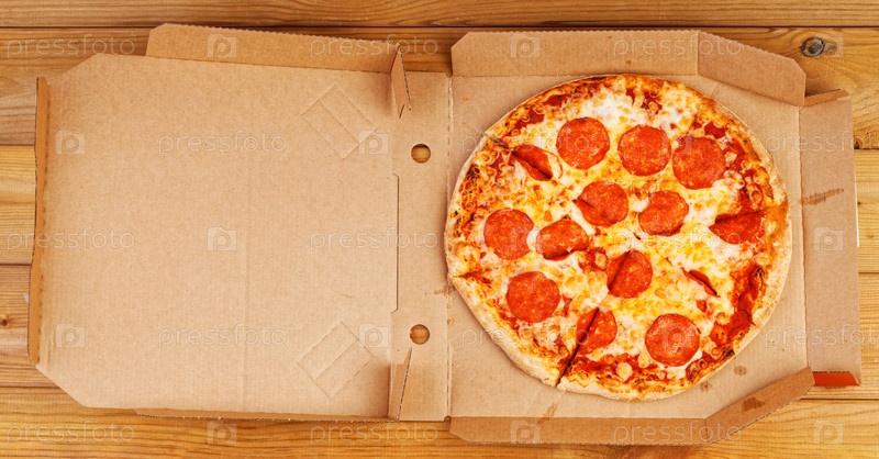 Открытая коробка с пиццей пепперони на деревянном столе. Вид сверху