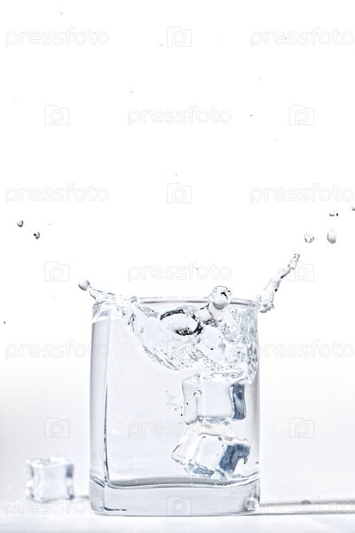 Брызги воды в стакане с кубиками льда на белом фоне
