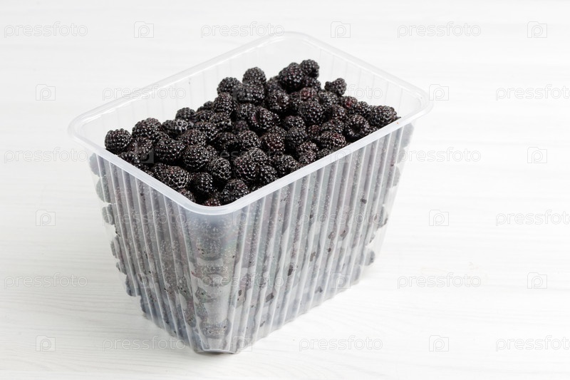 Свежая черная малина в пластиковой коробке на белом деревянном столе