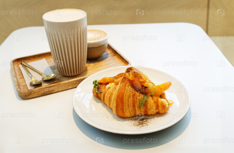 Круассан с лососем и яйцом на столике в кафе. Мелкий фокус