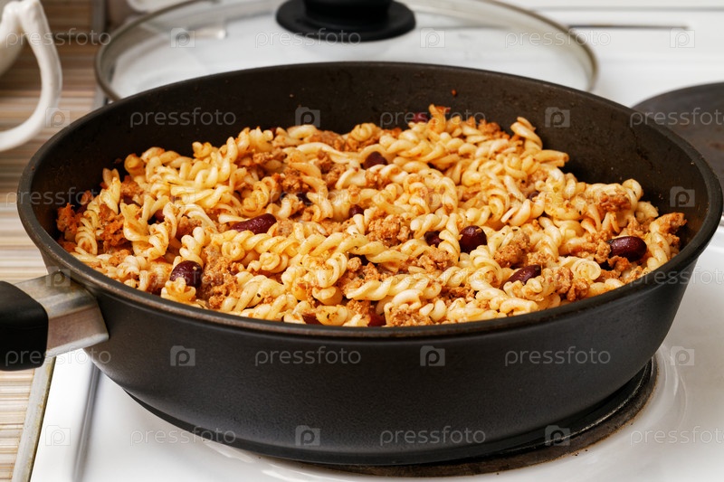 Крупный план домашней пасты пенне с чили кон карне и фасолью. Мелкий фокус