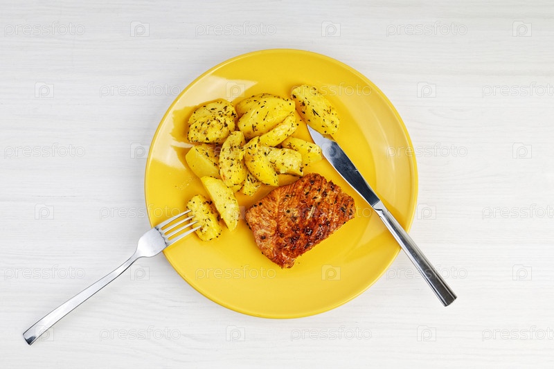 Стейк из индейки на гриле с гарниром из печеного картофеля в желтой тарелке на белом деревянном столе. Вид сверху