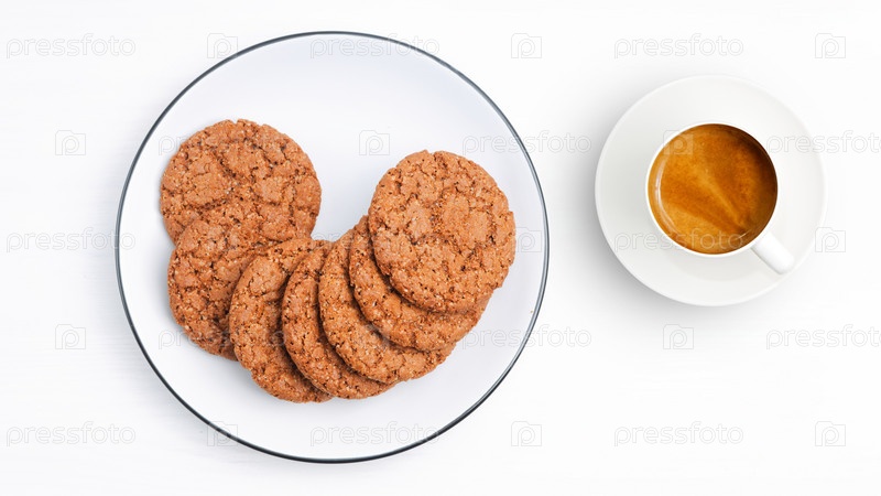 Шоколадное печенье и чашка кофе эспрессо на белом деревянном столе. Вид сверху