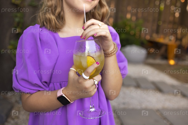 Портрет маленькой девочки, пьющей сок в стакане с соломинкой в открытом парке