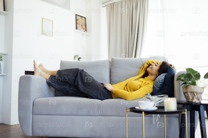 Спокойная расслабленная молодая афроамериканка смотрит в сторону, лежа на диване