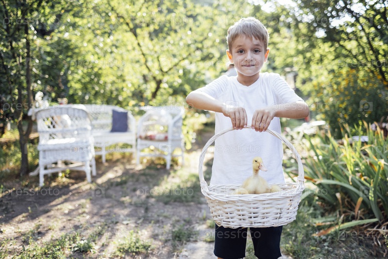 Маленький мальчик в белой футболке держит горшок с милыми птенцами. Ребенок и птицы