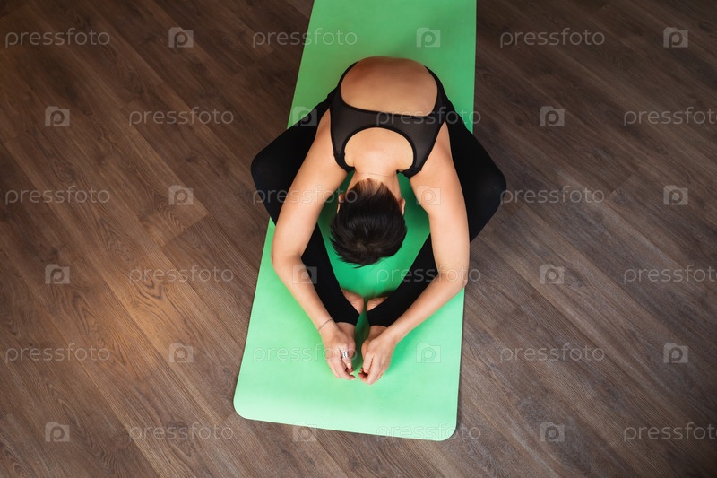 Женщина средних лет ведет здоровый образ жизни и занимается йогой, выполняет упражнение Курмасана для начинающих, позу черепахи, тренируется в студии, сидя на коврике в черной спортивной одежде