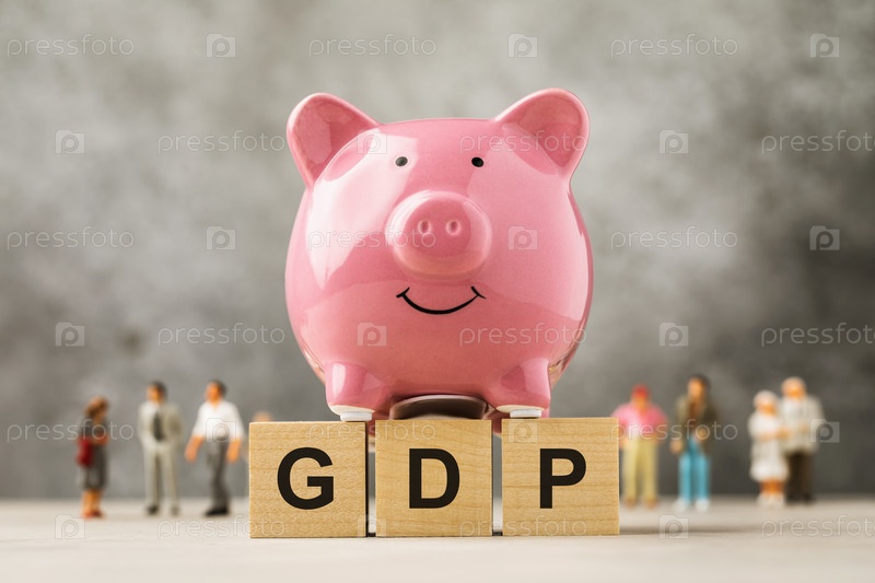 Копилка, деревянные кубики с текстом, игрушечные человечки из пластика на абстрактном фоне, концепция на тему ВВП
