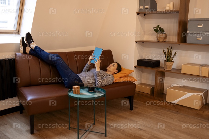 Красивая молодая женщина с помощью планшета сидит на диване дома в гостиной