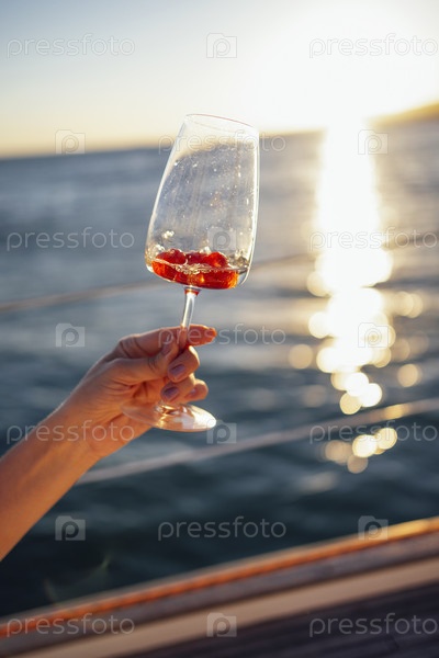 Закатное небо и море на заднем плане. Праздничный тост с игристым вином