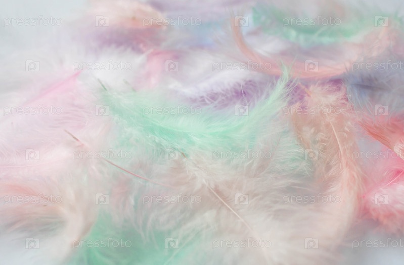 Красивый абстрактный фон из разноцветных перьев на белом фоне. Пушистая, мягкая текстура перьев пастельных тонов. Нежное знамя