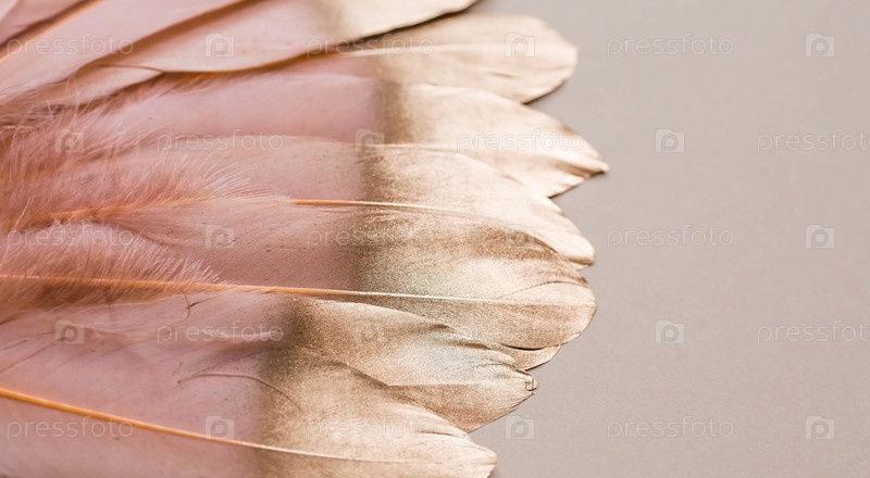Нежный бежево-золотой перо. Узор с золотыми перьями на светло-бежевом фоне. Вид сверху. Плоский