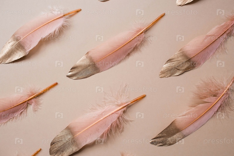 Нежный бежево-золотой перо. Узор с золотыми перьями на светло-бежевом фоне. Вид сверху. Плоский