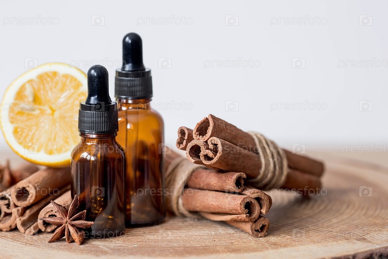 Ароматерапия. Массаж и спа. Косметические флаконы с эфирным маслом, палочками корицы, лимоном и звездчатым анисом на деревянной подставке. Натуральная косметика для тела