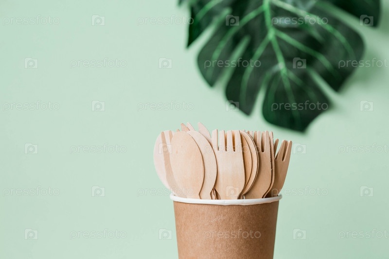Экологически чистые одноразовые кухонные принадлежности в бумажном стаканчике на бежево-зеленом фоне. Деревянные вилки, ложки и ножи. Экология, концепция безотходности