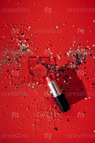 Косметический мазок нечеткой красной помады на прозрачном стекле. Яркий красный фон