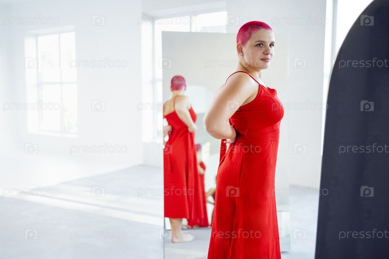Красивая расслабленная женщина в красном длинном платье и рыжих волосах смотрит в зеркало