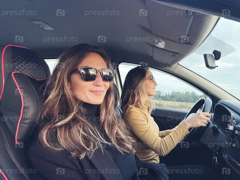 Довольно улыбающиеся женщины в солнечных очках водят машину. Белая подруга в желтом свитере водит машину и смотрит на дорогу. Брюнетка смотрит в камеру