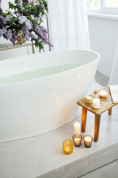 Современная ванная комната и спа-центр на деревянном столе с белой ванной