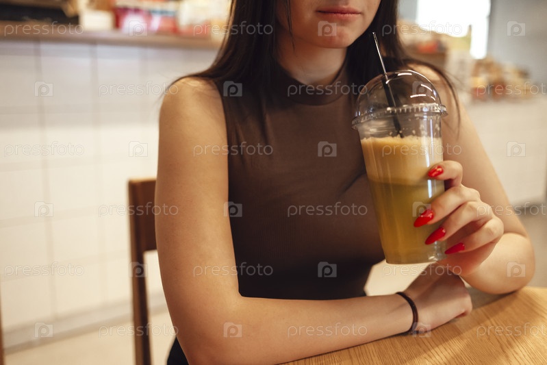 Счастливая молодая белая девушка пьет зеленые коктейли в стильном крытом кафе
