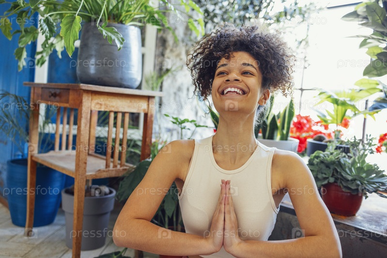 Афроамериканская этническая женщина в спортивной одежде сидит в позе йоги