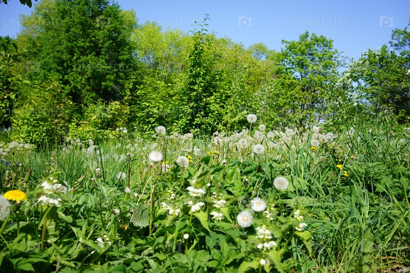 Природный ландшафт с пушистыми одуванчиками на поляне