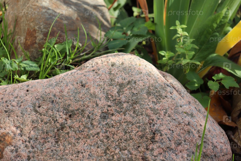 Серо-розовый декоративный камень на цветочной клумбе