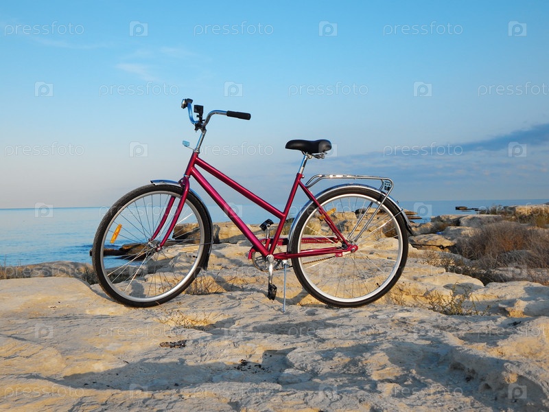 Велосипед на скалистом берегу моря. Скалистый берег Каспийского моря. Мангистауская область. Казахстан. 23 сентября 2020 года