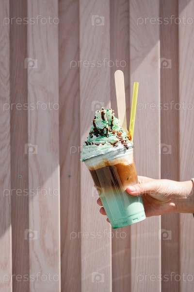 Мятно-шоколадный молочный коктейль на вынос в пластиковой чашке на фоне голубого неба