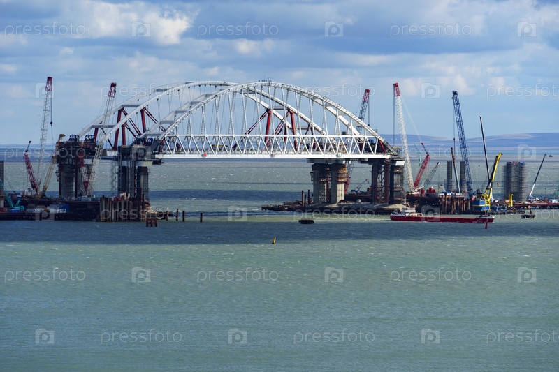 Морской пейзаж с видом на строящийся Крымский мост с берега Керчи, Крым