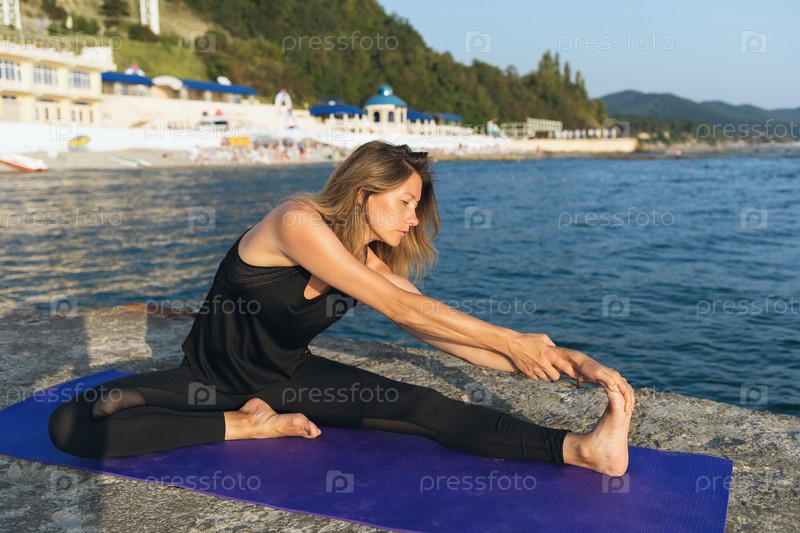 Женщина в спортивной одежде выполняет упражнение на растяжку мышц ног и спины, сидит на коврике летним солнечным вечером на пирсе у моря