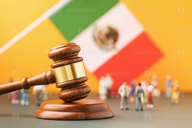 Деревянный молоток судьи, флаг и пластиковые игрушки на желтом фоне, концепция судебного разбирательства в мексиканском обществе