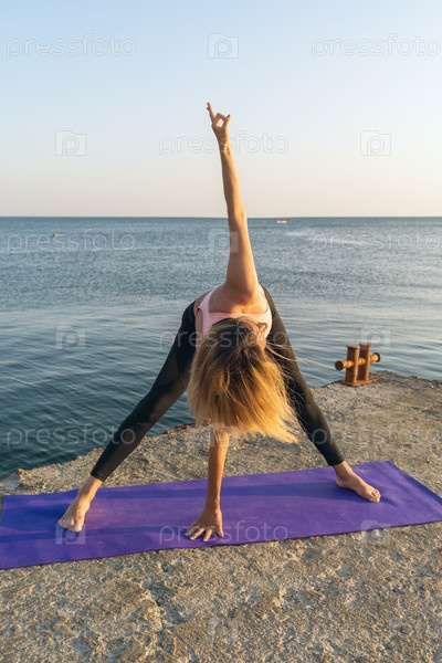 Женщина выполняет скручивание паривритта падоттанасана, стоя на пирсе, тренируясь солнечным летним вечером