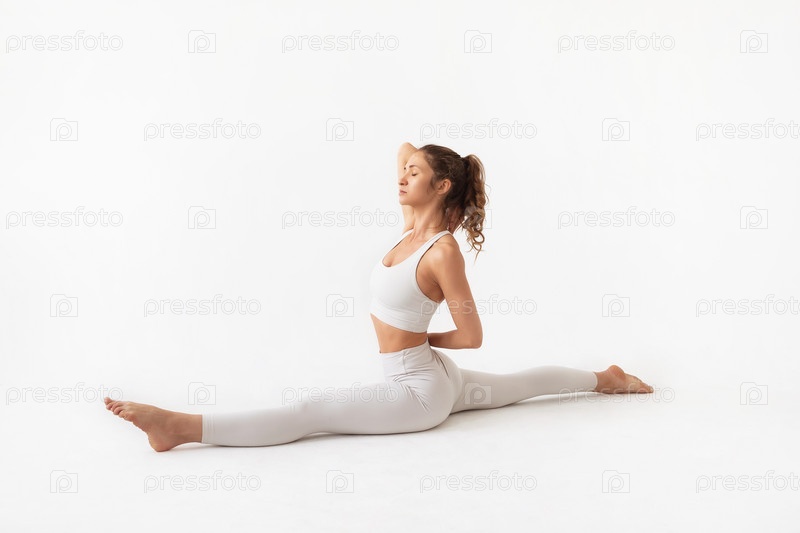 Молодая женщина, практикующая йогу, выполняющая вариацию упражнения Хануманасана с руками за спиной, поза с продольным расколом, тренирующаяся в белой спортивной одежде на светлом фоне