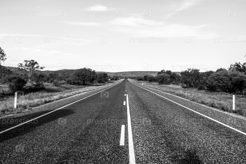 Пустая прямая асфальтовая дорога через австралийскую глубинку. Черно-белое изображение