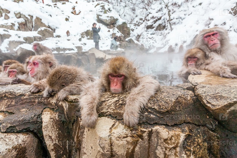 Группа снежных обезьян, спящих в горячем источнике, Япония