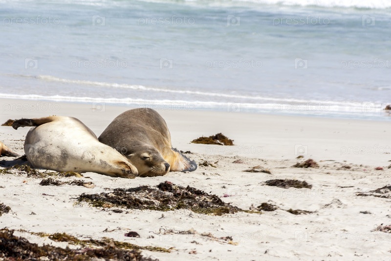 Спящие австралийские морские львы (Neophoca cinerea) на побережье острова Кенгуру, Южная Австралия, залив Сил