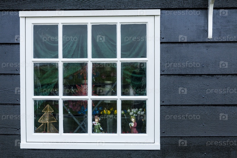 Деревянное окно старого голландского дома, украшенное к Рождеству