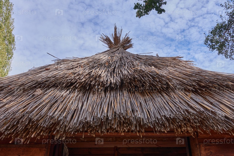 Сарай, покрытый бамбуком. Старая соломенная крыша курятника на фоне голубого облачного неба