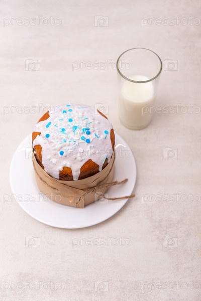 На столе кулич и стеклянный стакан с молоком. На столе кулич и стеклянный стакан с молоком. Свободное место для информации. Вид сверху