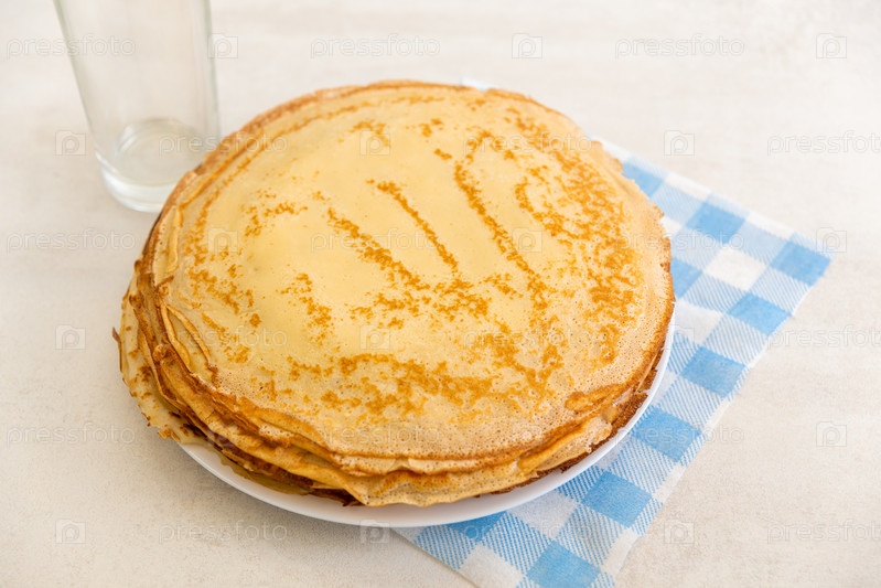Стопка свежеиспеченных блинов и пустой стакан на сине-белой салфетке на столе. Пространство для размещения информации. Вид сверху. Масленичный концерт
